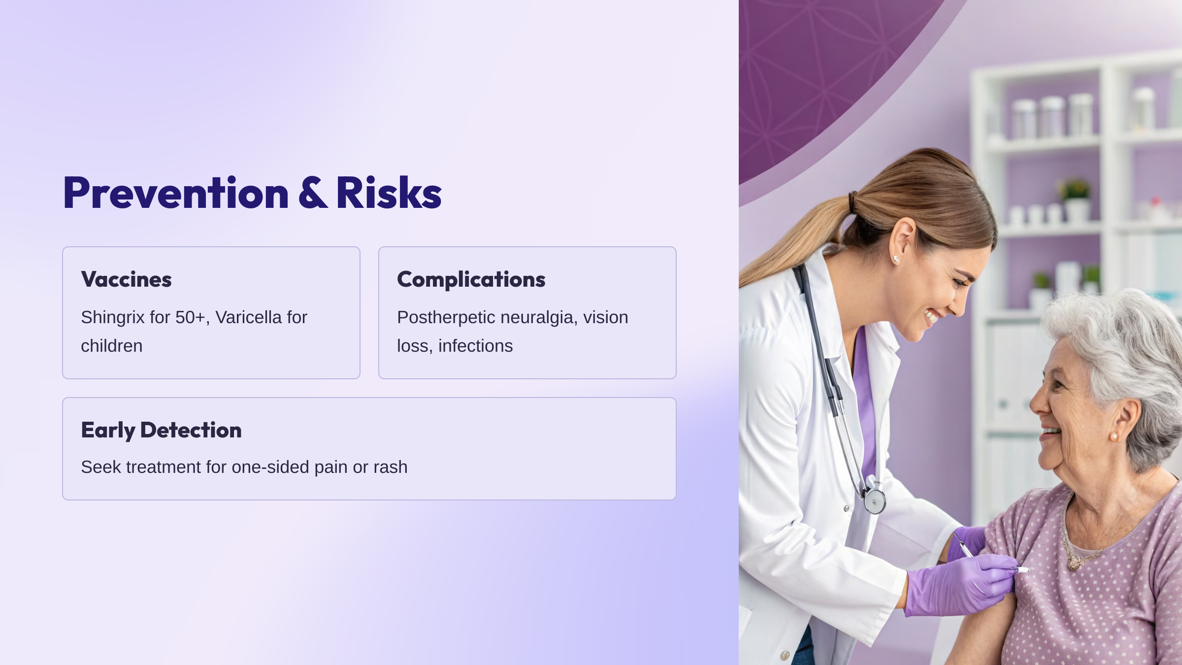 Vaccination is the best preventive measure. The varicella vaccine protects against chickenpox, while the Shingrix vaccine (recommended for adults over 50) reduces the risk of shingles by over 90%.