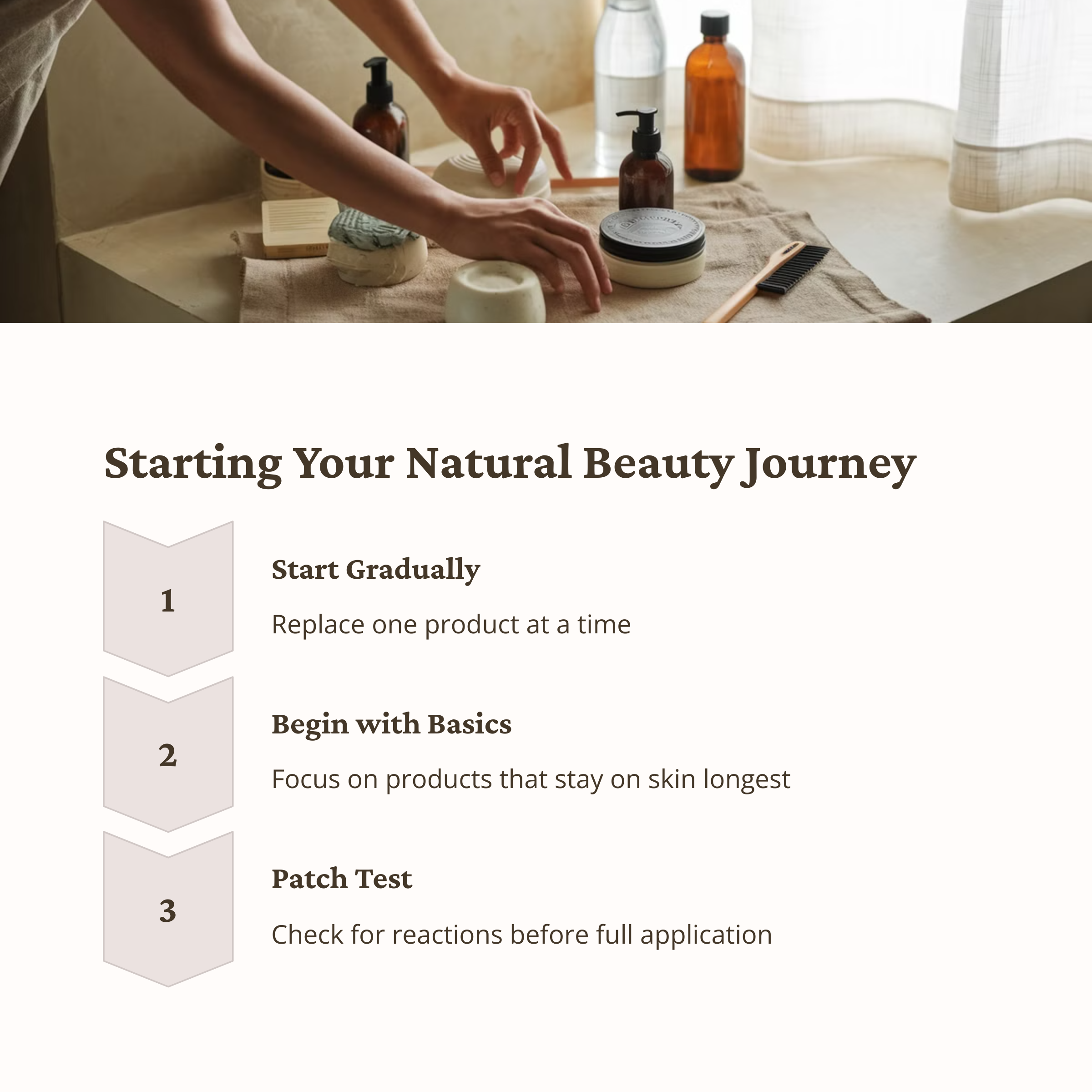 Start gradually by replacing one product at a time, beginning with items that stay on your skin longest (like moisturizers or serums). This approach helps identify which natural products work best for you and minimizes potential skin reactions from changing everything at once.