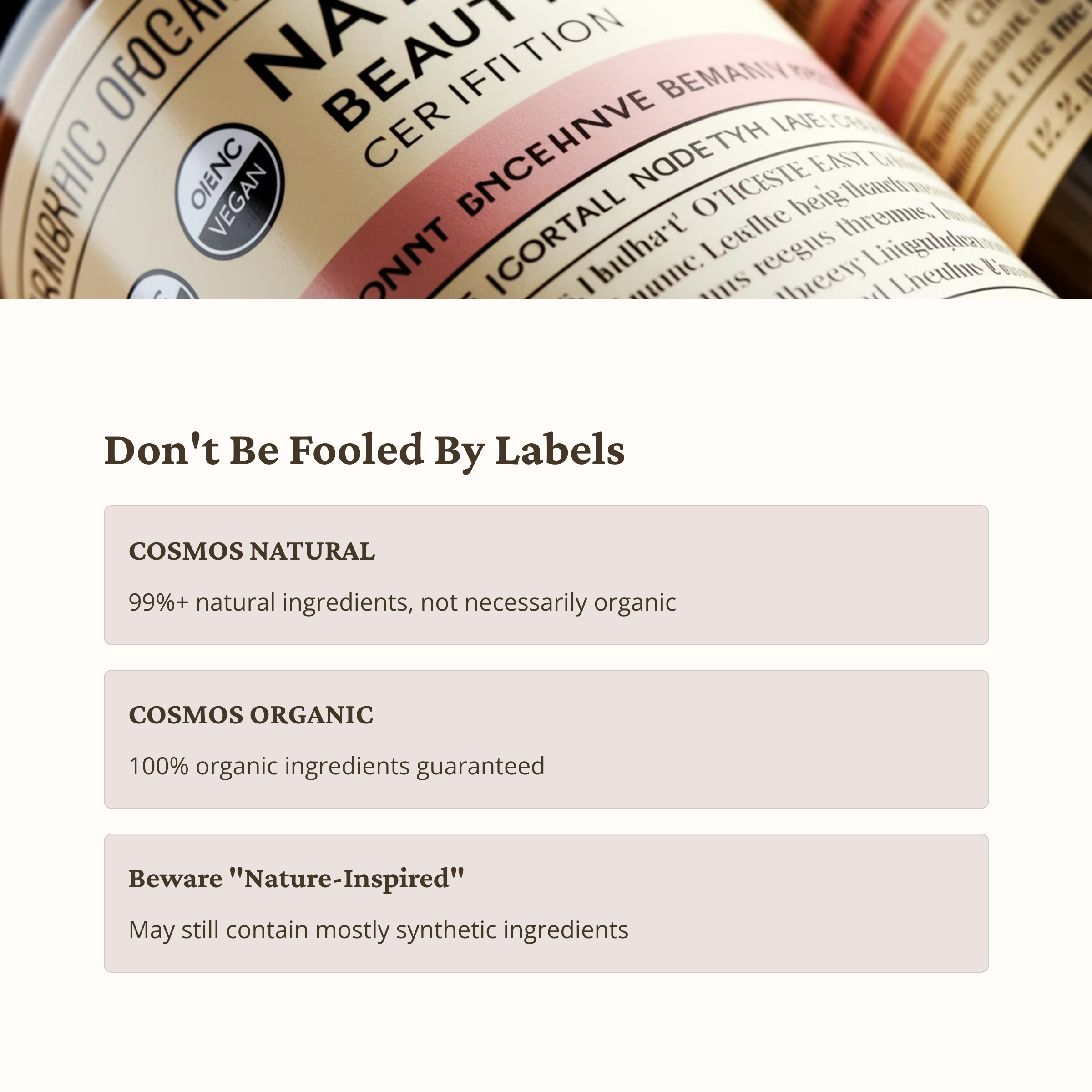 Look for reputable certifications like COSMOS ORGANIC or COSMOS NATURAL. Check ingredient lists carefully—products labeled "natural" should have minimal synthetic ingredients. Be wary of terms like "nature-inspired" which may indicate minimal natural content.