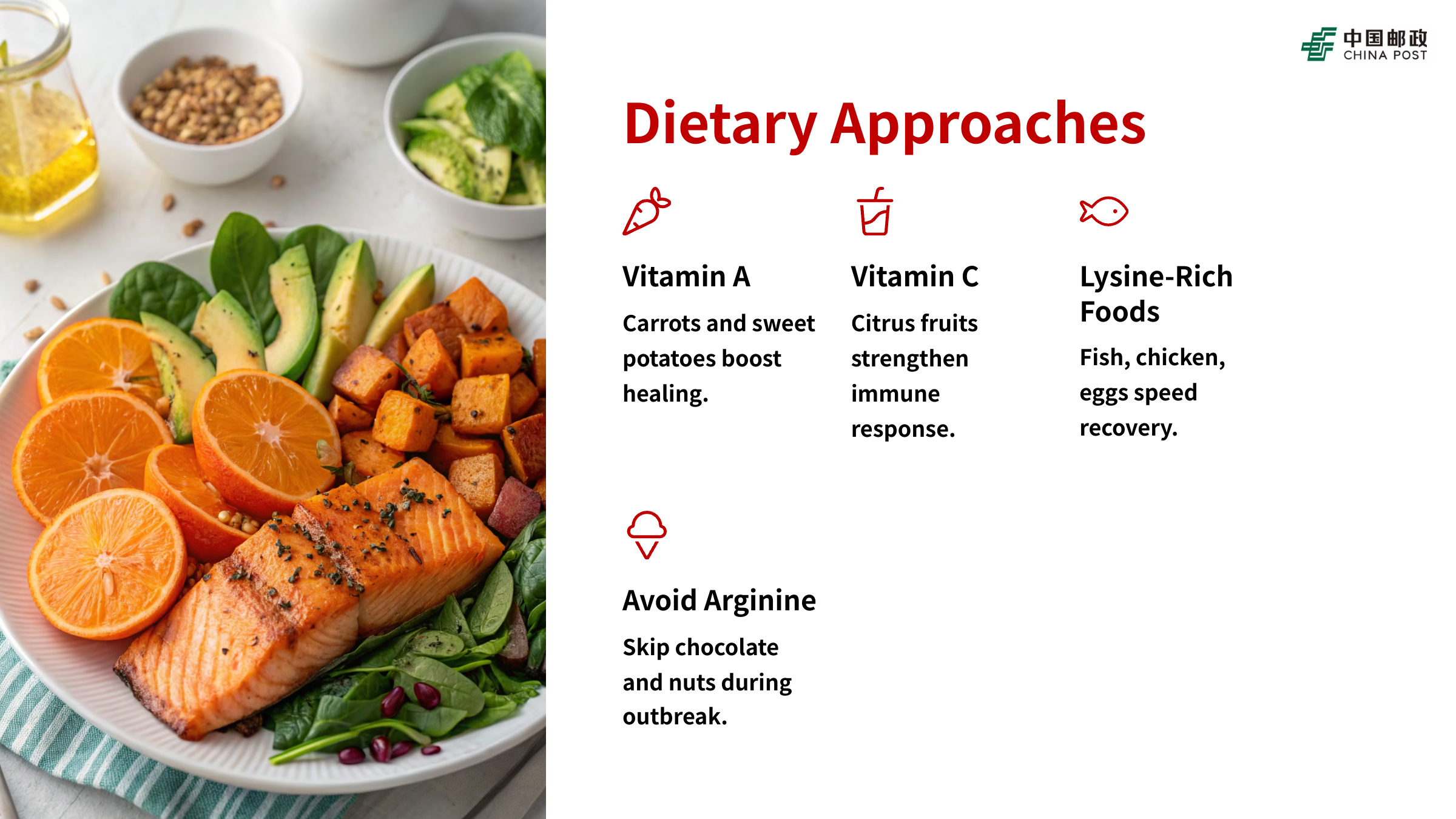 Now, let’s chow down on diet stuff. What you eat matters big time. I steer towards foods that are jam-packed with vitamins A, B-12, C, and E, plus lysine for an immune boost.