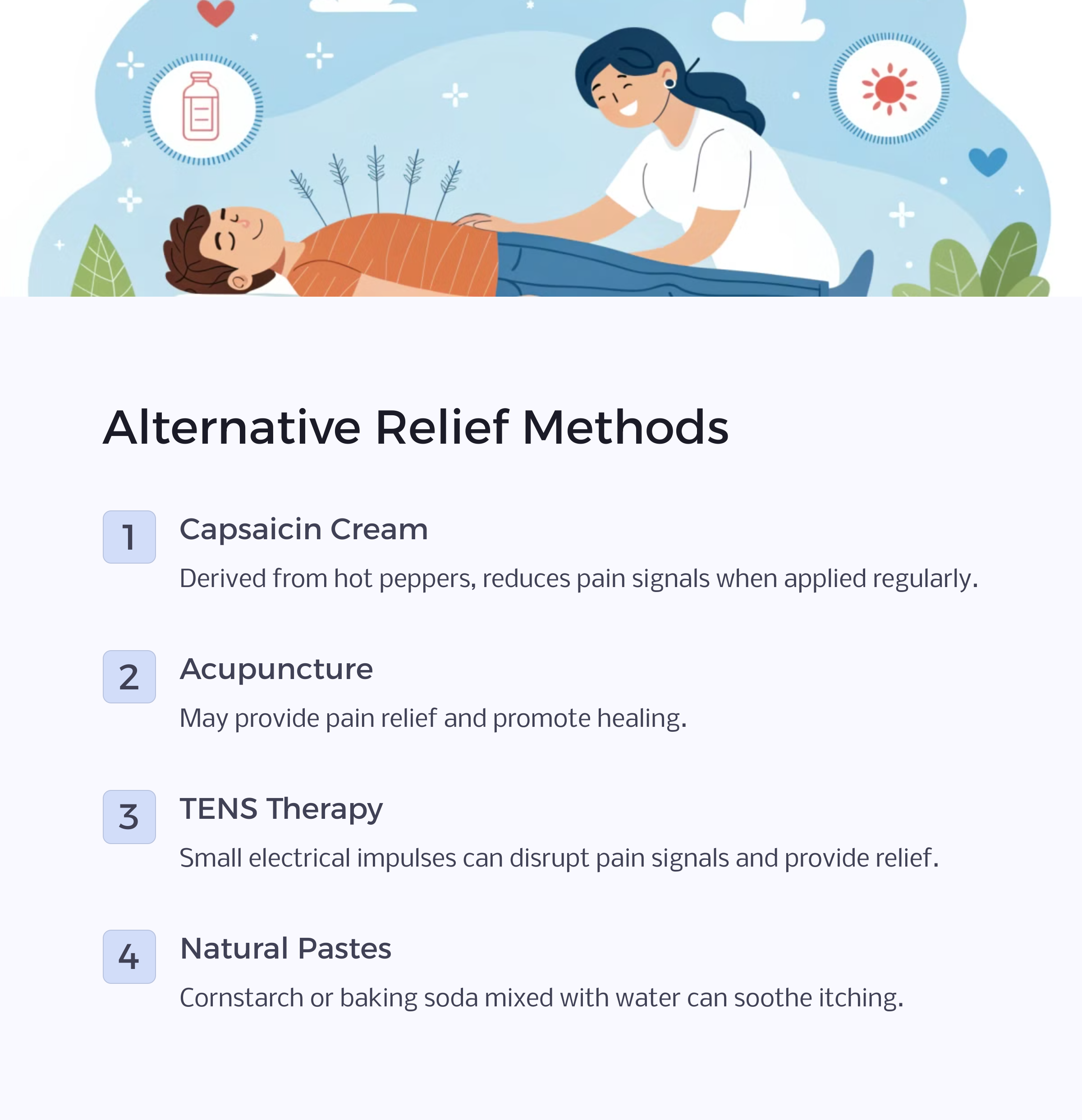 Yes! Cool compresses can reduce burning sensations, oatmeal baths help calm itchy skin, and aloe vera gel provides a soothing effect. Some people find relief using capsaicin cream (derived from chili peppers), which may help block pain signals.