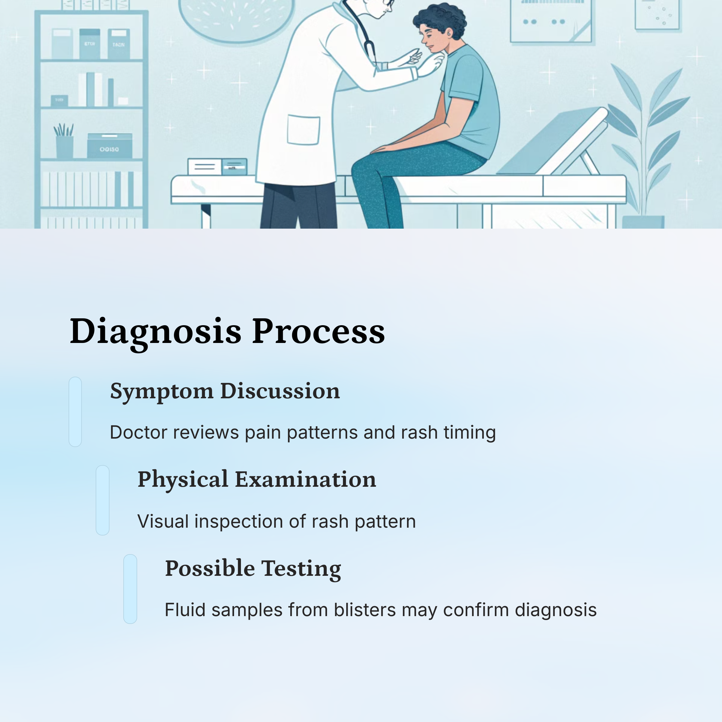 Doctors typically diagnose shingles based on visual examination of the rash and your symptoms. In some cases, they may perform a swab test from the blisters or conduct lab tests to confirm the presence of the varicella-zoster virus.