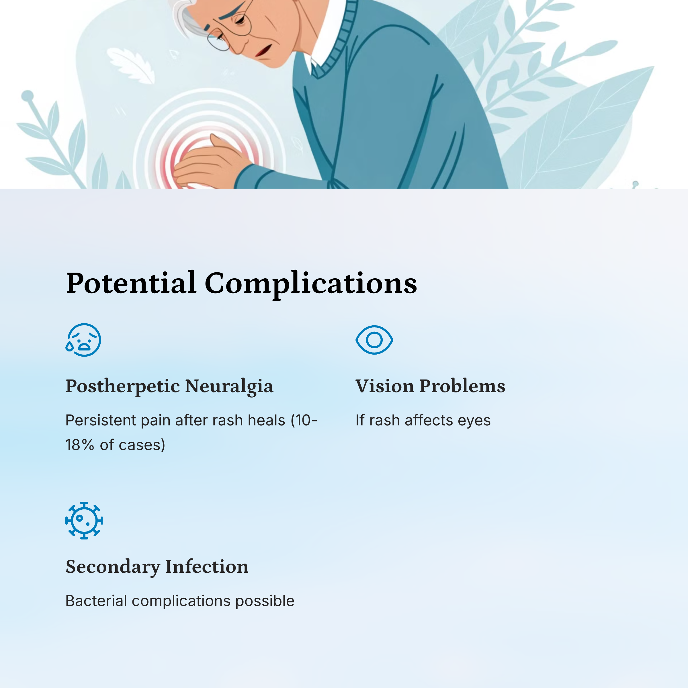 📌 Explains chronic nerve pain risks post-shingles, including age-based statistics (10–18% likelihood in adults over 50).
