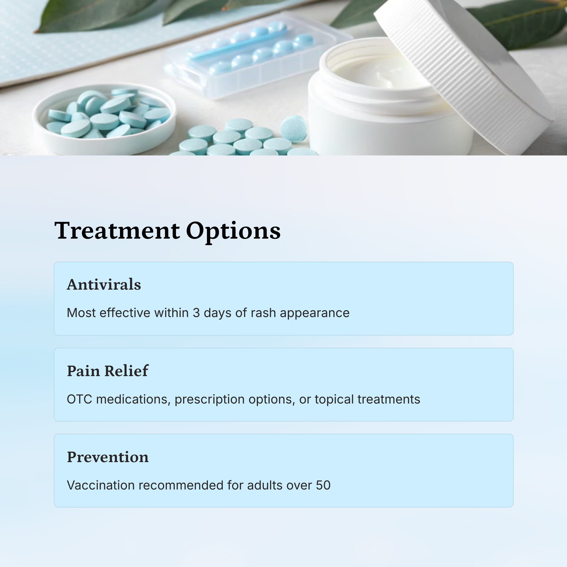 📌 Details on antiviral drugs (acyclovir, valacyclovir) and their effectiveness when administered within 72 hours of symptom onset.
