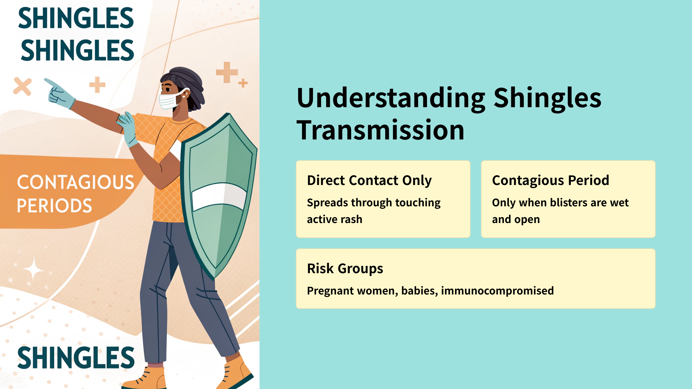 | Direct Contact | Mainly through touching the shingles rash. |