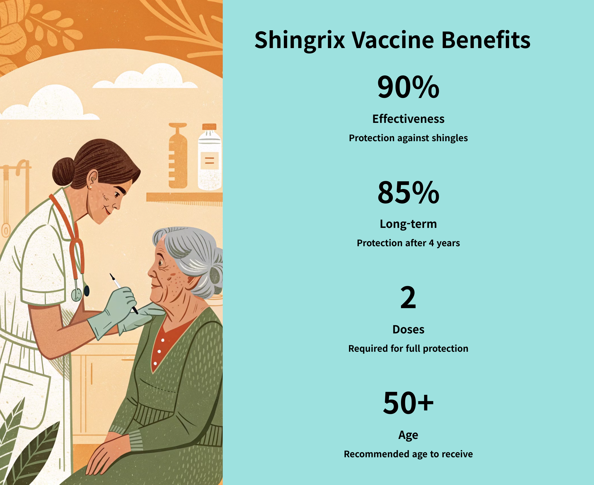 | 50 years and older | 2 doses | Keep shingles and its buddies away |